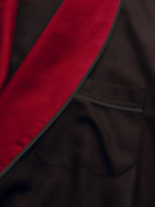 This satin Black Robe comes in z-black pure satin polyester comes with a contrasting burgundy shawl collar , 3 Pockets (one is chest pocket other 2 are lower side pockets) and a black satin belt for closing your fit. The whole robe is lined at borders with a matching black satin lining which gives it better strength at the fabric borders and alluring visuals.