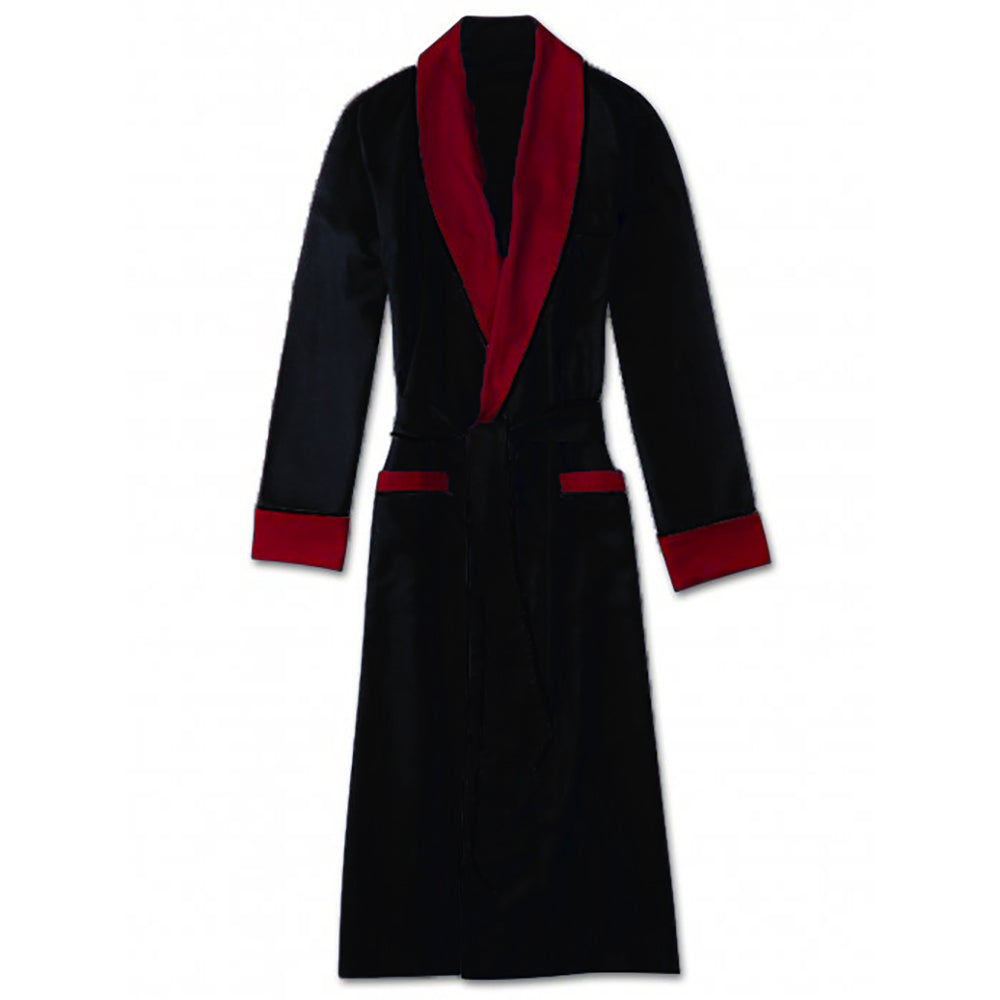 Heavyweight Black Silky Satin Robe with Contrasting Burgundy Shawl Collar